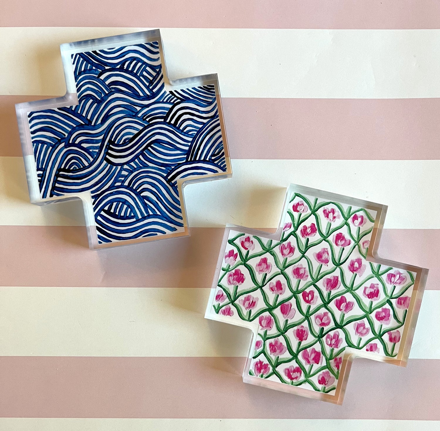 Freestanding acrylic crosses featuring hand painted patterns.