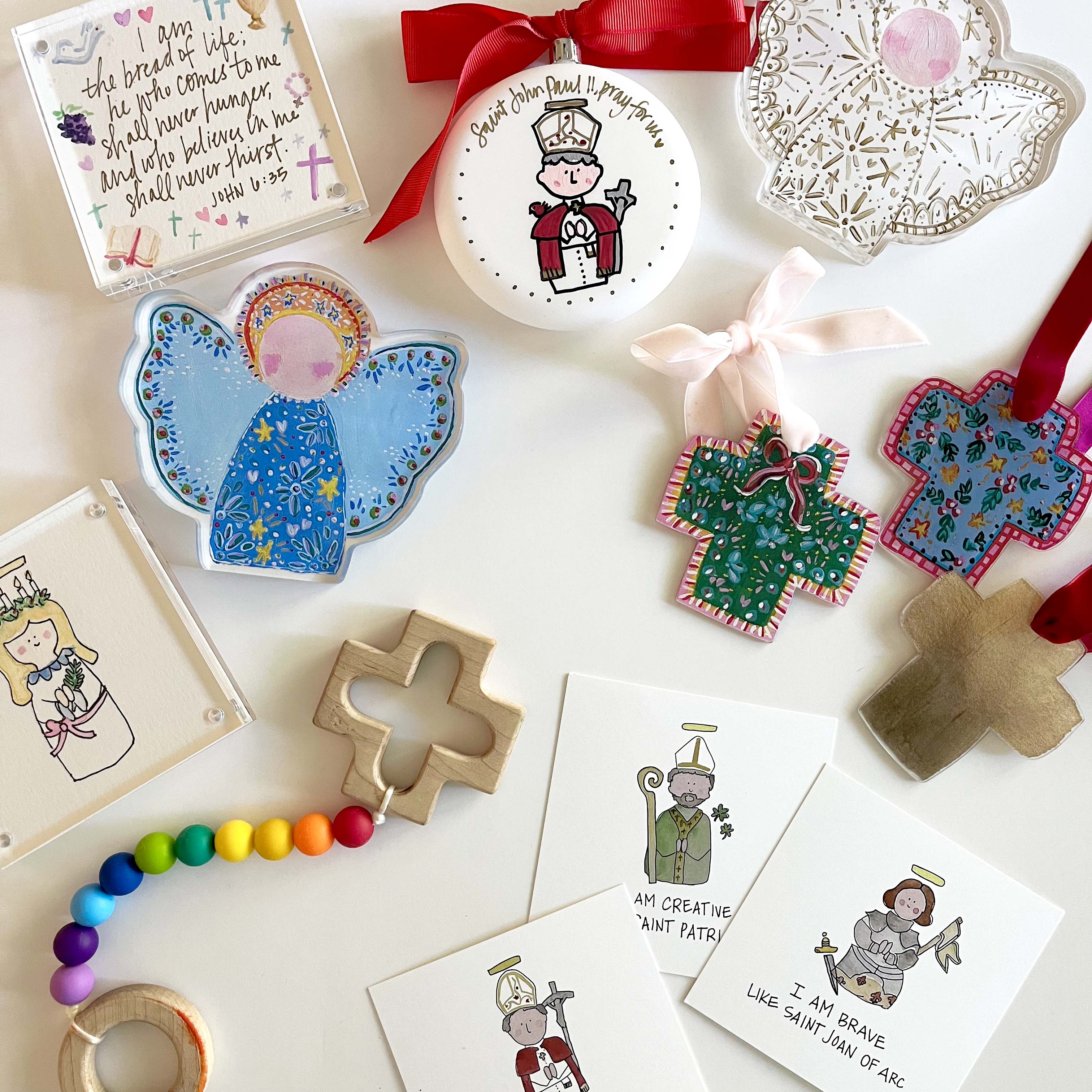 We aspire to bring faith to life within your home. From decorative acrylics and custom paper goods, to rosaries and baby teethers, we hope to create something inspirational for each member of your family.