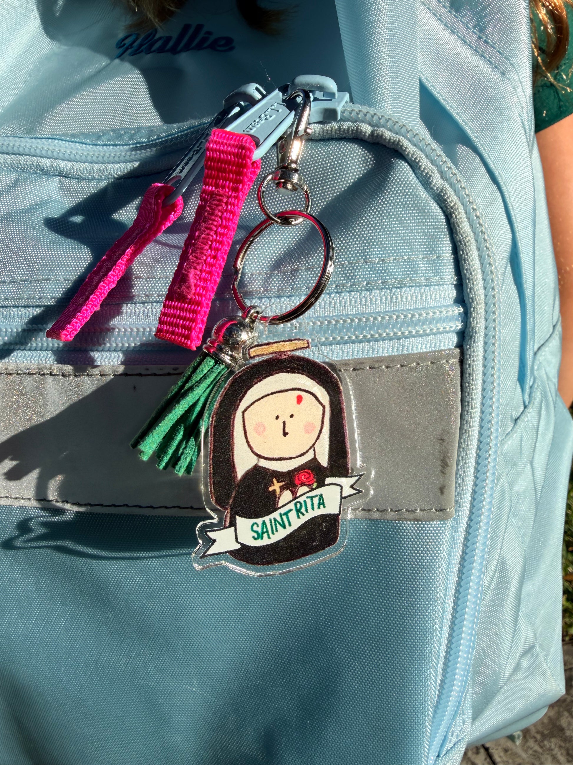 Carry this sweet reminder of Saint Rita on your backpack, keychain or bag!